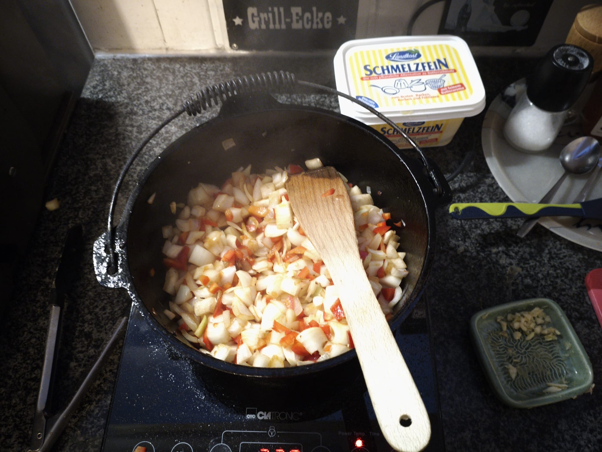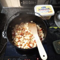 Den Dutch Oven (ich nutze einen 4,5L Dopf) bei voller Hitze gut vorheizen, Butterschmalz hineingeben und heiß werden lassen.