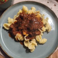 Nach 1 1/2 Std. die Butter hinzugeben, schmelzen lassen und final abschmecken. Sollte die Soße zu flüssig sein, kann diese mit etwas Stärke oder Mehl zusätzlich angedicket werden.
